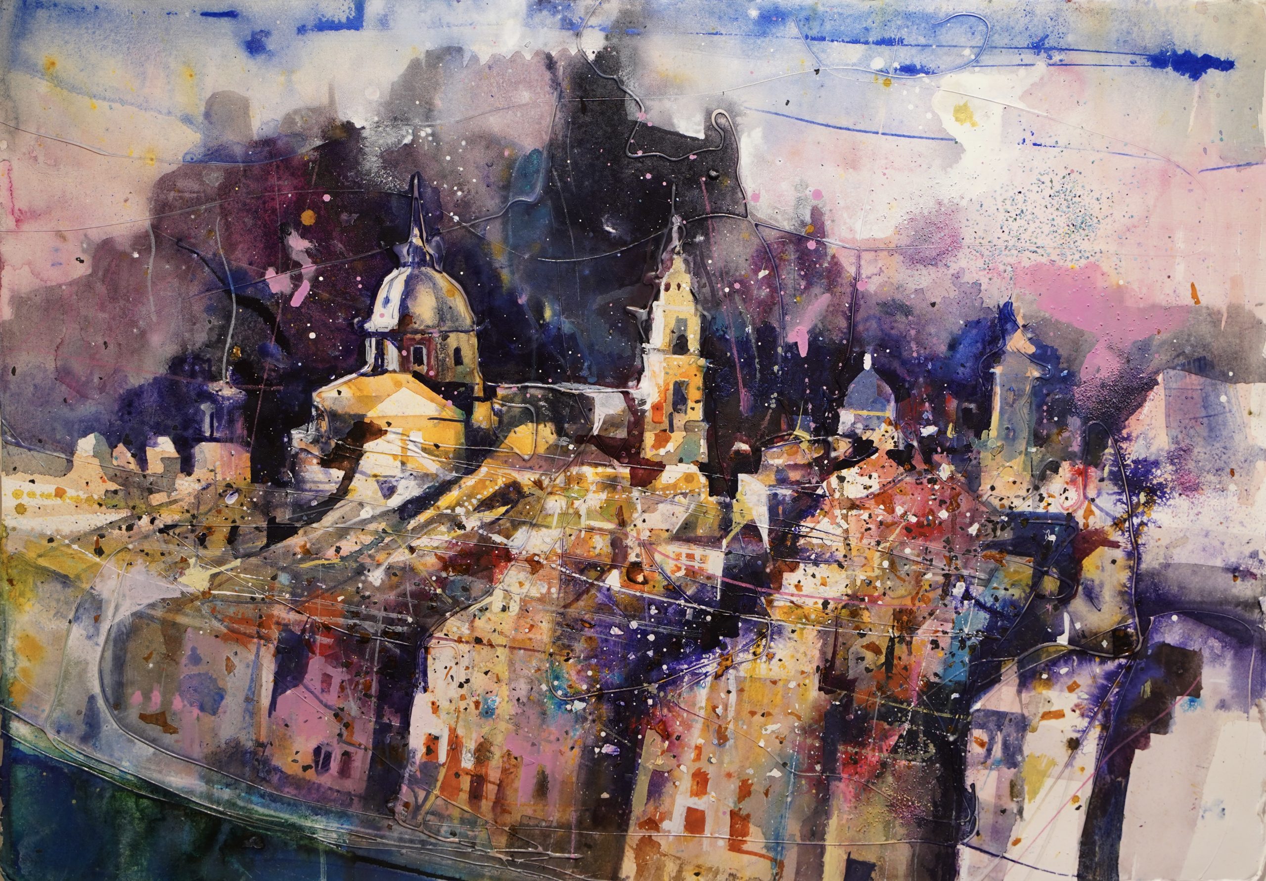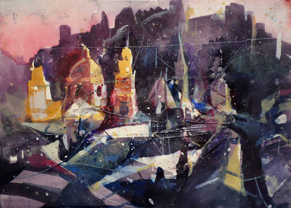 Bernhard Vogel, Altstadt vom Kapuzinerberg, Mixed Media Aquarell, 56 x 76 cm, 2020
