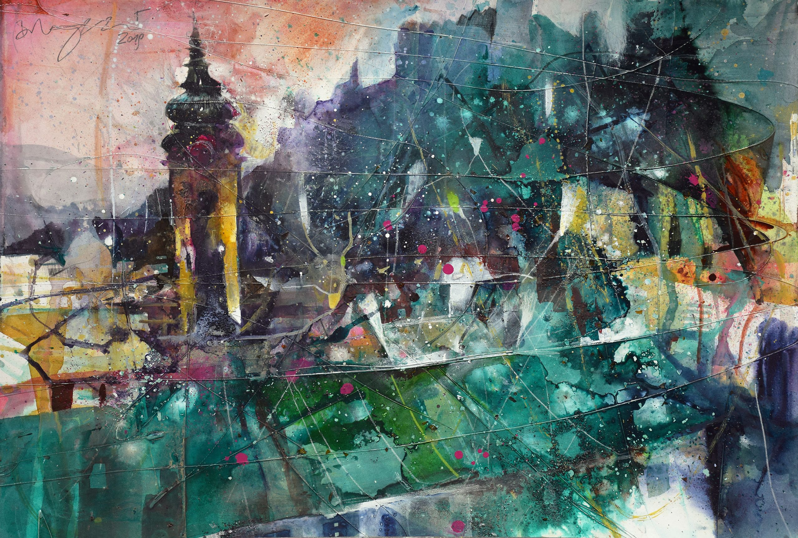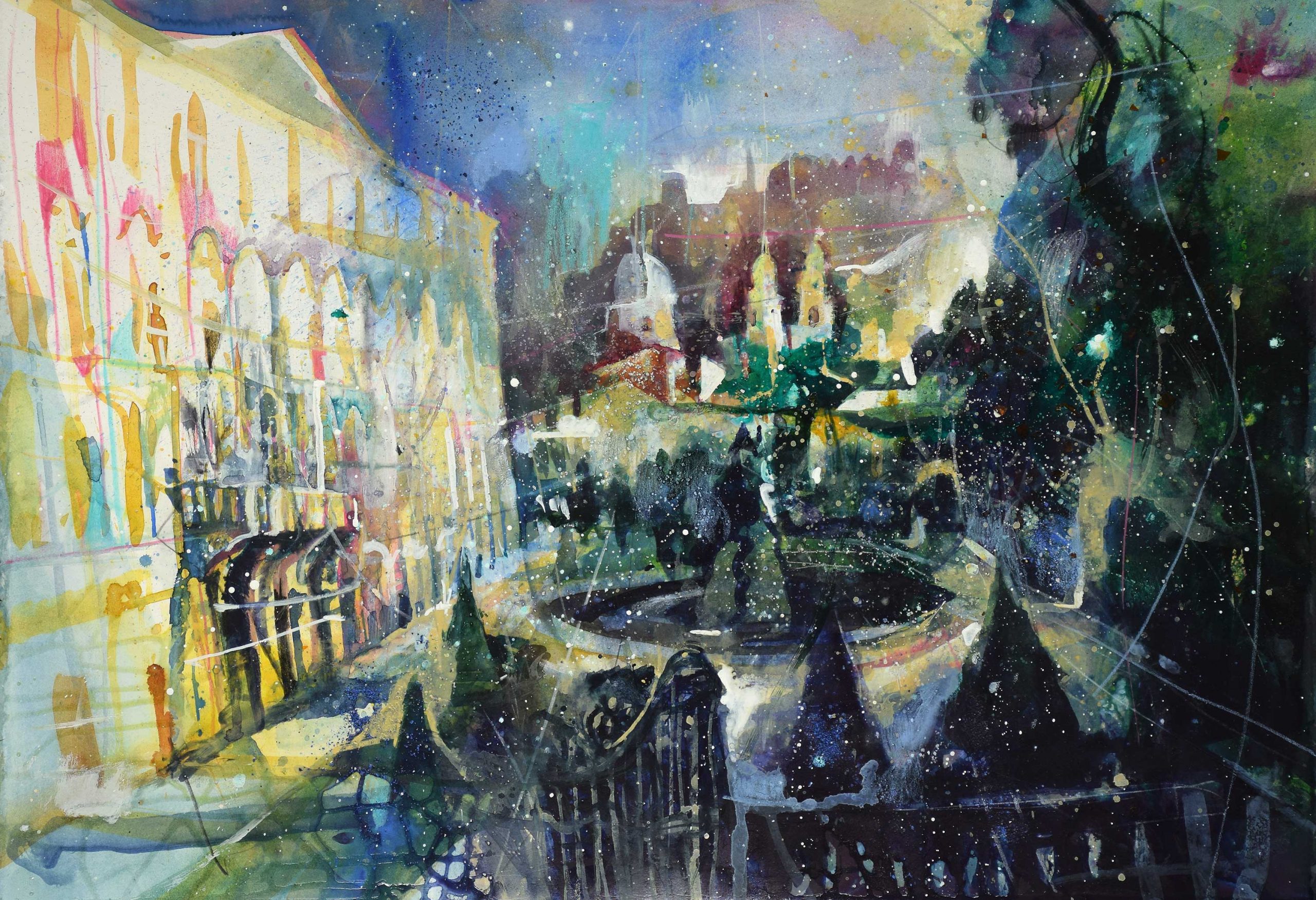 Die Mixed Media Arbeiten sind im doppelten Sinne vielschichtig – sie zeigen alle Facetten New Yorks, Abgründe und Versprechungen ebenso wie Freuden der Stadt. Die Leinwände werden mit unterschiedlichen Techniken collageartig aufgebaut. Salzburg hingegen wird in Aquarellen des Künstlers in einer unvergleichlichen Art und Weise zu Papier gebracht. Ebenso vielschichtig, doch zarter und ruhiger. Alles eben Portraits von Städten und Menschen.